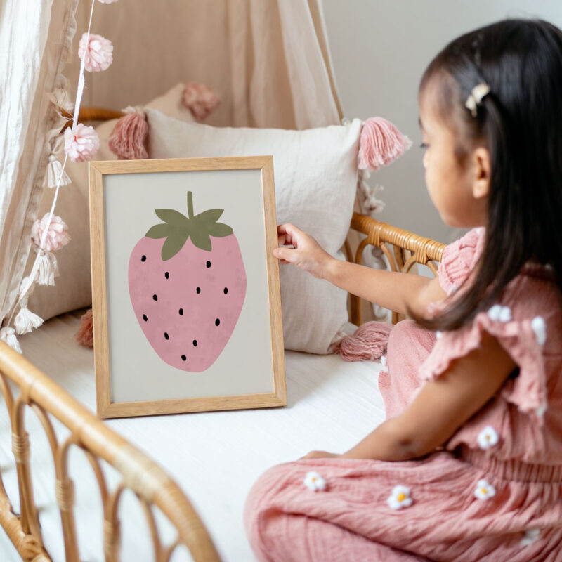 Douce et fruitée, cette jolie fraise rose poudrée à l’aquarelle apporte une touche de fraîcheur et de tendresse à la décoration. Avec son style minimaliste et poétique, elle trouvera parfaitement sa place dans une chambre d’enfant, une salle de jeu ou une cuisine joyeuse. Une illustration simple mais pleine de charme, à offrir ou à s’offrir !