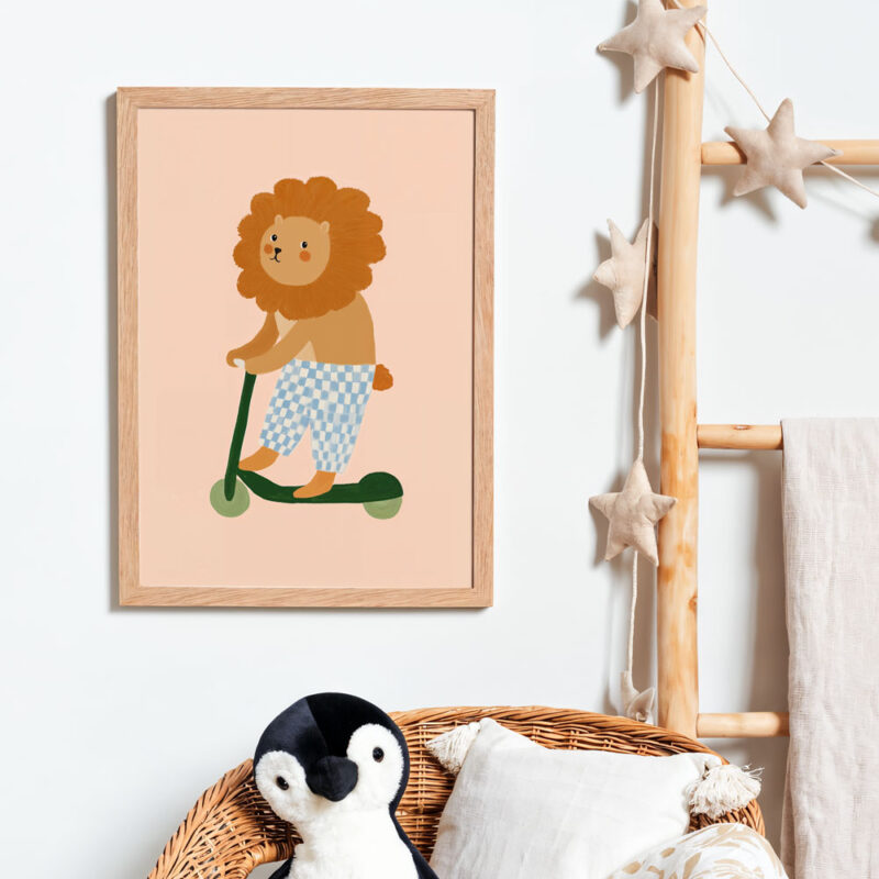 Faites entrer l’énergie et la bonne humeur dans la chambre de votre enfant avec cette affiche originale à l’aquarelle représentant un lion rigolo en short à damier bleu, lancé à toute vitesse sur sa trottinette ! Sur un fond orange éclatant, ce roi de la jungle décontracté apporte une touche de fun et de mouvement à la déco. Parfaite pour stimuler l’imaginaire des petits aventuriers, cette illustration pleine de vie s’intègre aussi bien dans une chambre qu’un espace de jeux. Affiche fabriquée en France avec soin — une création unique pour une déco joyeuse et pleine de personnalité.