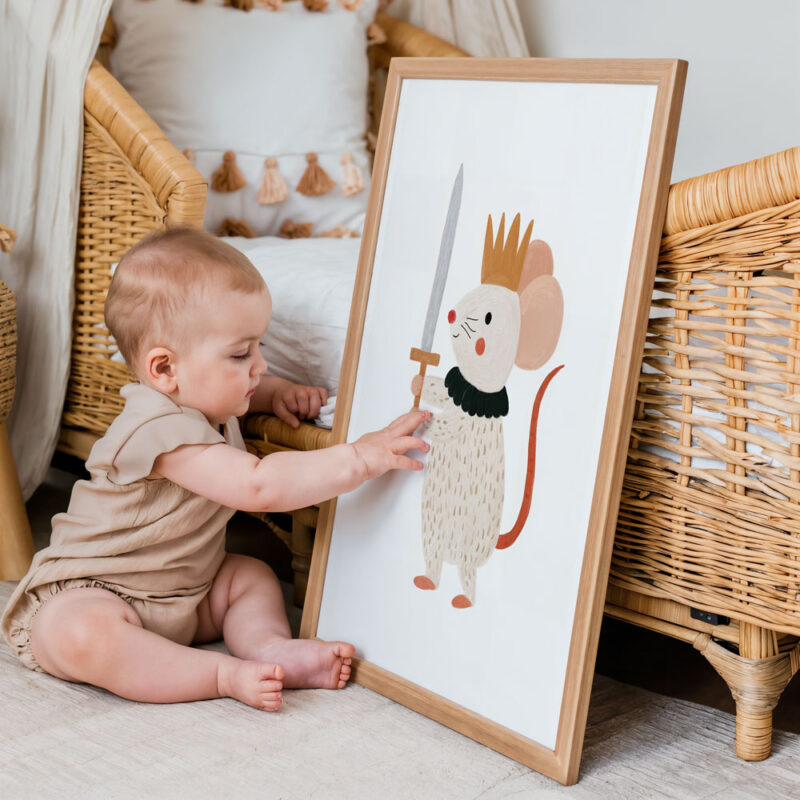 Couronnée d’or et armée de sa fidèle lame, cette souris pas comme les autres veille sur son royaume miniature avec sagesse et malice. Imprimée en France sur un papier haut de gamme, cette affiche au charme délicat est parfaite pour décorer une chambre d’enfant, nourrir l’imaginaire et inviter à mille aventures.