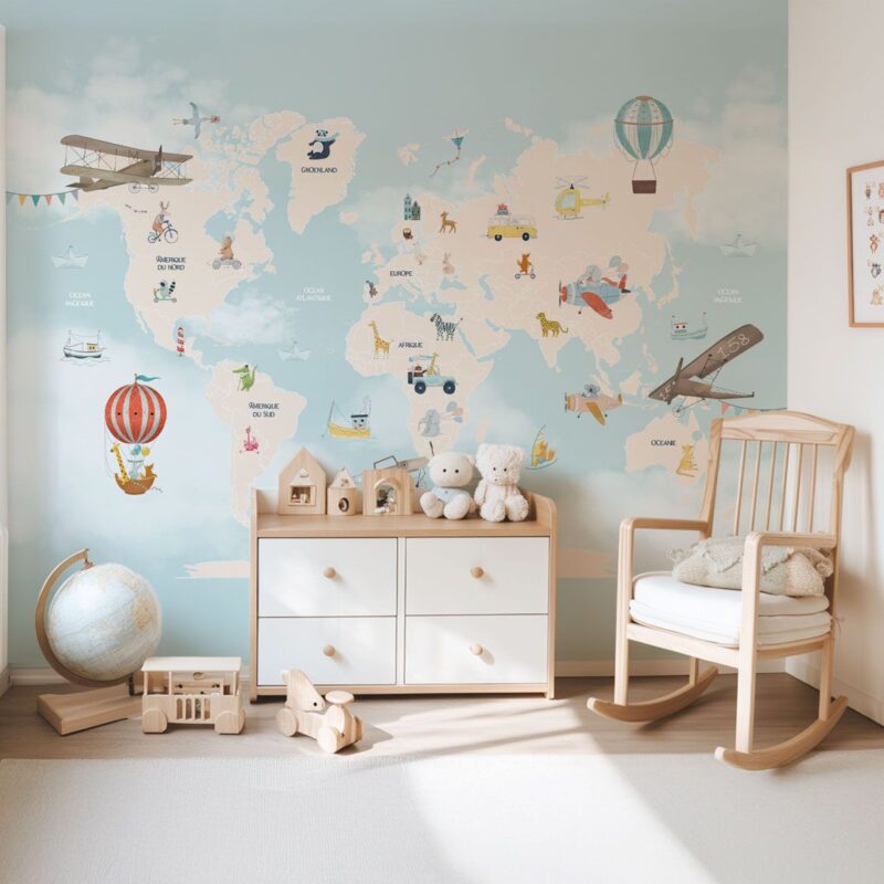 Ce papier peint enchanteur combine décoration et apprentissage, avec des animaux emblématiques de chaque continent, stimulant ainsi la curiosité et l’imagination des petits explorateurs.
