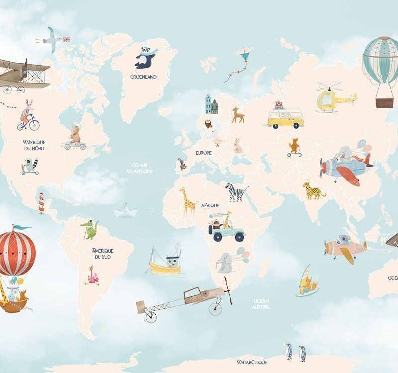 Offrez à votre enfant un voyage autour du monde avec notre papier peint panoramique Animaux Voyageurs ! Sur un fond bleu ciel doux parsemé de nuages, cette carte du monde prend vie grâce à de charmants animaux explorateurs : un éléphant pilote d’avion, une girafe et sa tribu en montgolfière, un lion en safari en Afrique, et bien d’autres aventuriers parcourant les océans et le ciel à bord de bateaux et d’hélicoptères.