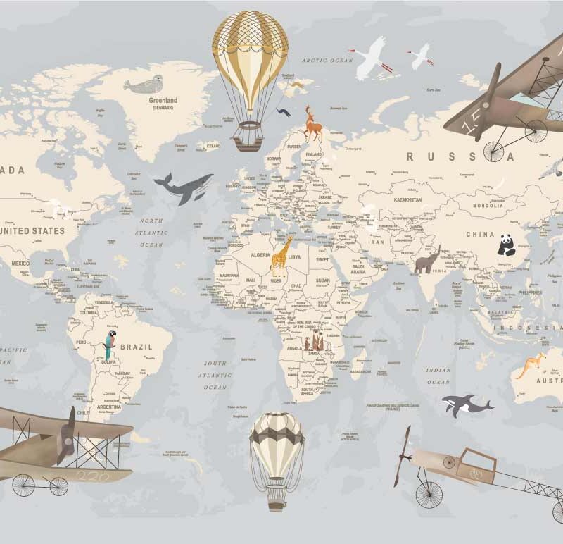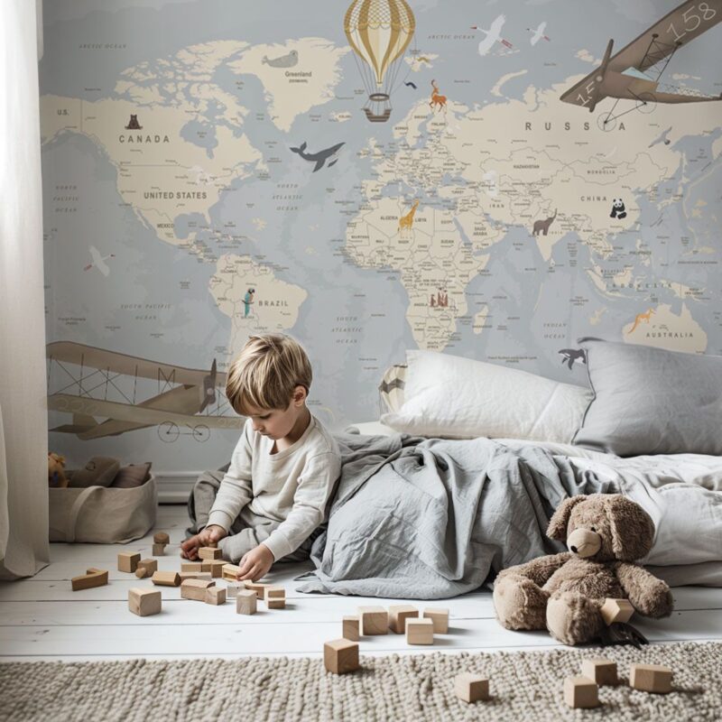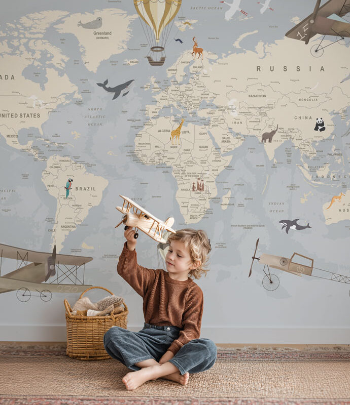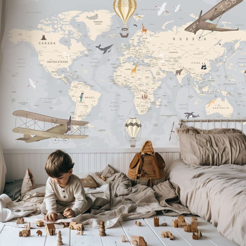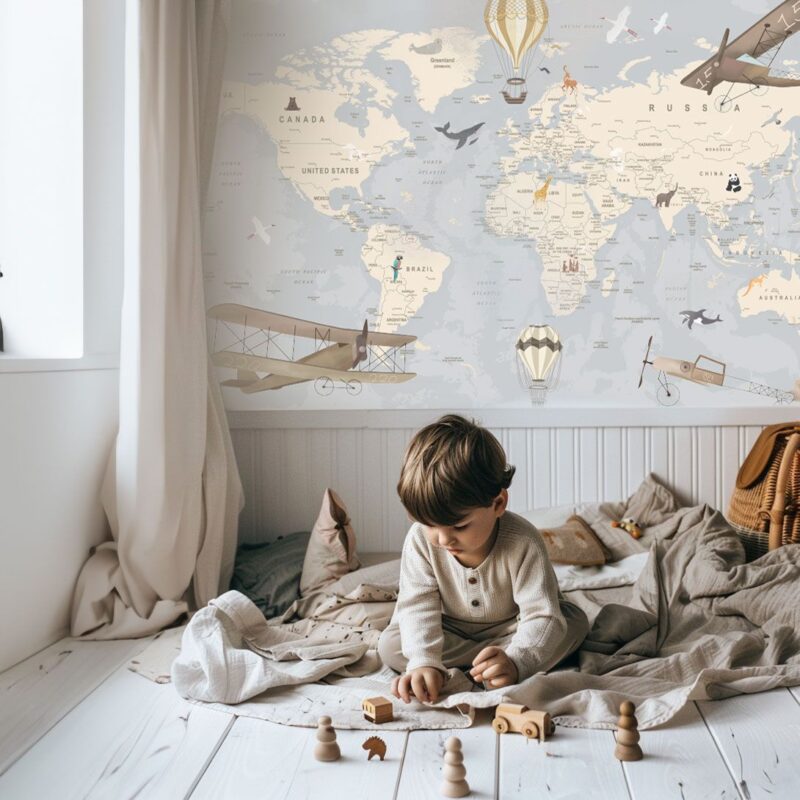 Plongez dans une exploration fascinante avec notre carte du monde détaillée pour enfants. Faites découvrir à vos enfants les continents merveilleux de notre planète et ses villes du monde. Dans un style vintage, dans les tons bleus et beige, cette carte est une véritable invitation au voyage, parsemée de détails éducatifs. Des montgolfières et des avions survolent les terres lointaines, ajoutant une touche de magie à cette aventure cartographique. Des animaux emblématiques animaux cette carte des merveilles, éveillant la curiosité des petits explorateurs. Disponible dans une variété de couleurs, ce papier peint ludique et éducatif est parfait pour transformer la chambre d'un enfant en un sanctuaire de découverte et d'apprentissage.
