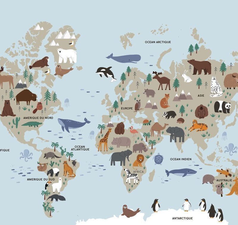 Faites voyager votre enfant à travers les continents avec ce papier peint panoramique ludique et éducatif. Sur un fond bleu apaisant, cette magnifique carte du monde illustrée met en scène les animaux emblématiques de chaque région : un éléphant en Afrique, un panda en Asie, un kangourou en Australie et bien d’autres encore !