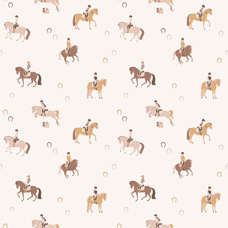 Des petits fers à cheval, subtilement disposés, viennent compléter cet univers équestre avec une touche décorative élégante et harmonieuse. Parfait pour une chambre d’enfant ou une chambre bébé, ce papier peint aux tons beiges apporte une atmosphère apaisante et inspirante, idéale pour encourager l’imaginaire et la passion des jeunes amoureux des chevaux.