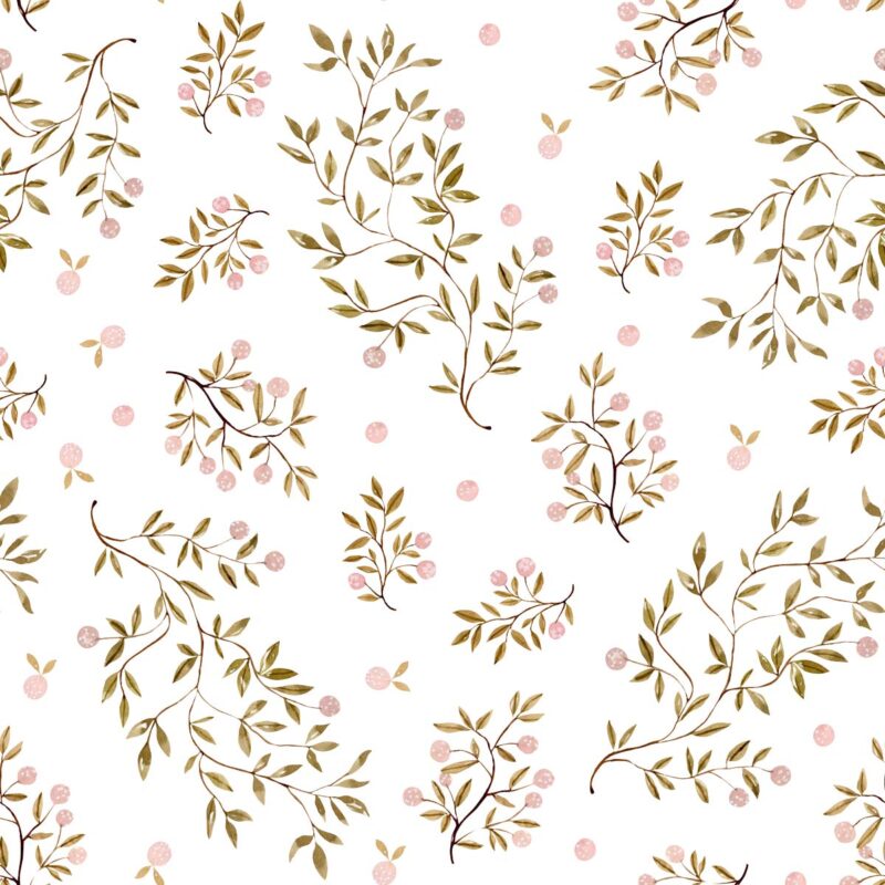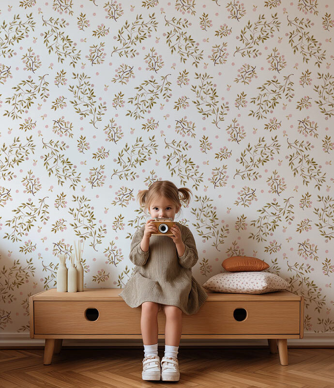 Offrez à la chambre de votre enfant une touche champêtre et raffinée avec ce papier peint feuillage rose. Ses motifs répétitifs de feuillage vert et doré associés à des touches de rose créent une ambiance douce, apaisante et pleine de fraîcheur, idéale pour une chambre fille. Le design subtil et élégant ajoute une atmosphère de nature tout en apportant un éclat de couleur, parfait pour transformer l’espace en un lieu paisible et inspirant.