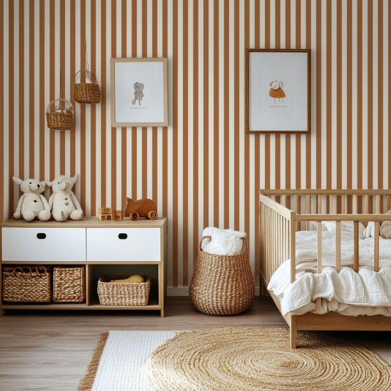 Les rayures marron, à la fois classiques et contemporaines, ajoutent de la profondeur à votre espace tout en conservant un style intemporel. Ce motif discret et polyvalent convient aussi bien aux chambres d’enfants qu’aux chambres d’adultes, et s’harmonise avec de nombreux styles de décoration, du minimaliste au bohème.