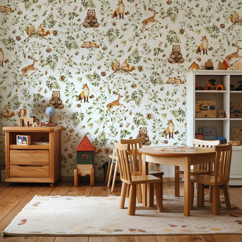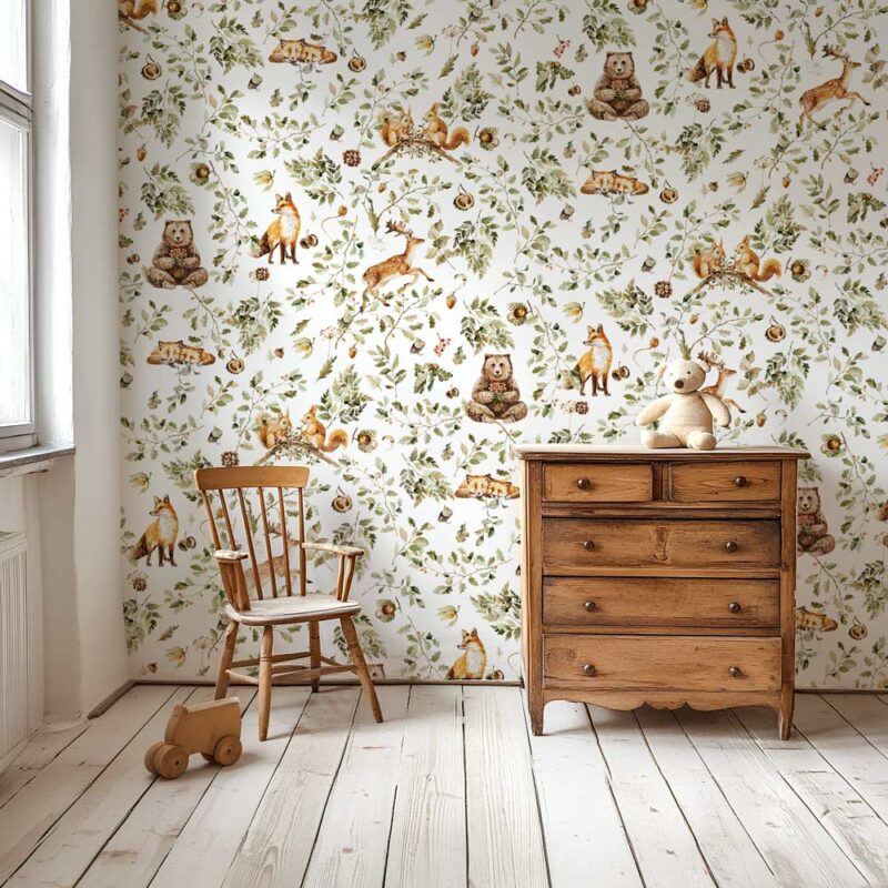 Plongez dans un univers enchanteur avec notre papier peint "Forêt d'Automne Vintage". Conçu spécialement pour les chambres d'enfants, ce motif captivant capture la magie des sous-bois en automne avec un style vintage plein de charme. Chaque détail est minutieusement dessiné : les feuillages aux couleurs chaleureuses se mêlent aux animaux de la forêt comme les écureuils malicieux, les biches gracieuses, les ours paisibles et les renards curieux. Ce motif répétitif crée une atmosphère douce et apaisante, parfaite pour stimuler l’imagination et transporter les petits rêveurs dans une forêt enchantée. Idéal pour créer une ambiance cosy et naturelle, ce papier peint apporte une touche de nostalgie et de poésie à tout espace enfantin, tout en invitant à l’aventure et à la découverte.
