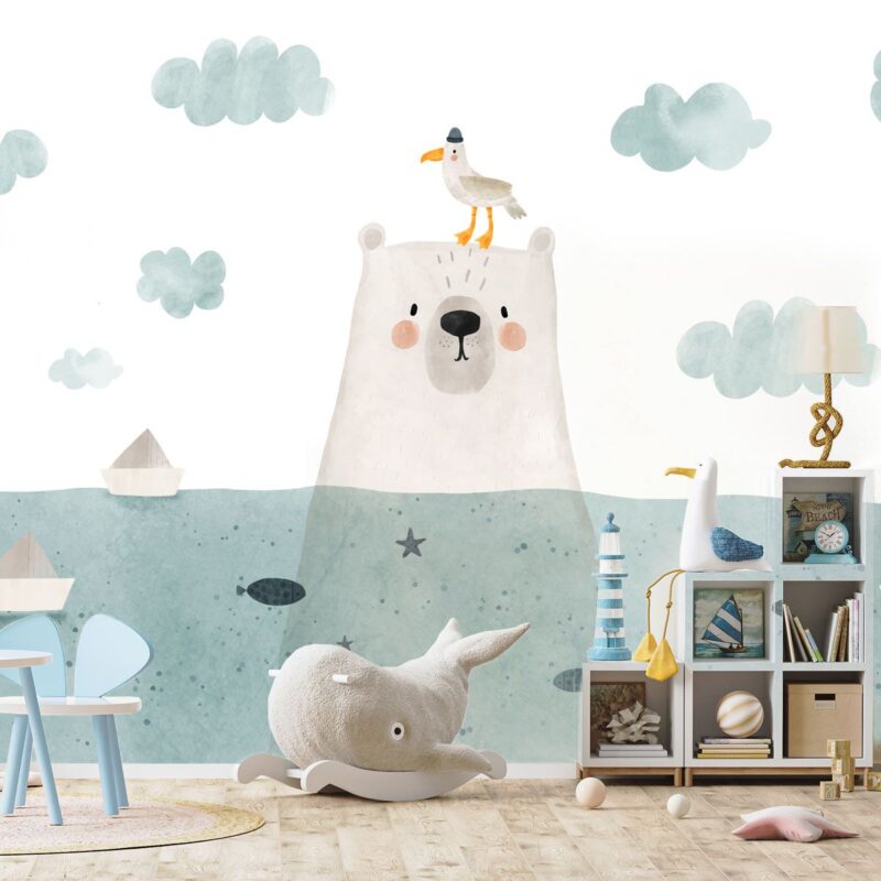 Embarquez pour une douce aventure avec ce papier peint enfant au design minimaliste et apaisant. Au cœur de l’image, un ours blanc paisible flotte sur l’océan, une mouette perchée sur sa tête, observant les petits poissons et bateaux qui voguent au gré des vagues. Autour d’eux, de douces nuances de bleu, des nuages légers, et une ambiance poétique qui invite à l’évasion. Idéal pour une chambre d’enfant, ce papier peint océan apporte une touche de sérénité et de rêverie à la décoration. Son design épuré et ses tons apaisants s’adaptent parfaitement à un univers marin et naturel. Fabriqué sur-mesure, ce papier peint bleu transforme la pièce en un véritable havre de douceur, propice à l’imagination et aux rêves d’aventure !
