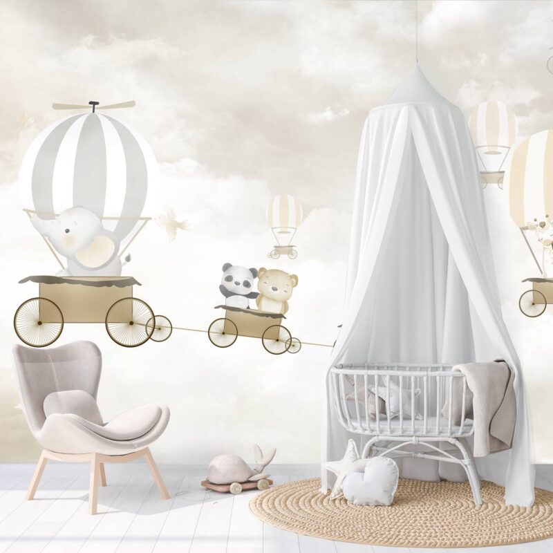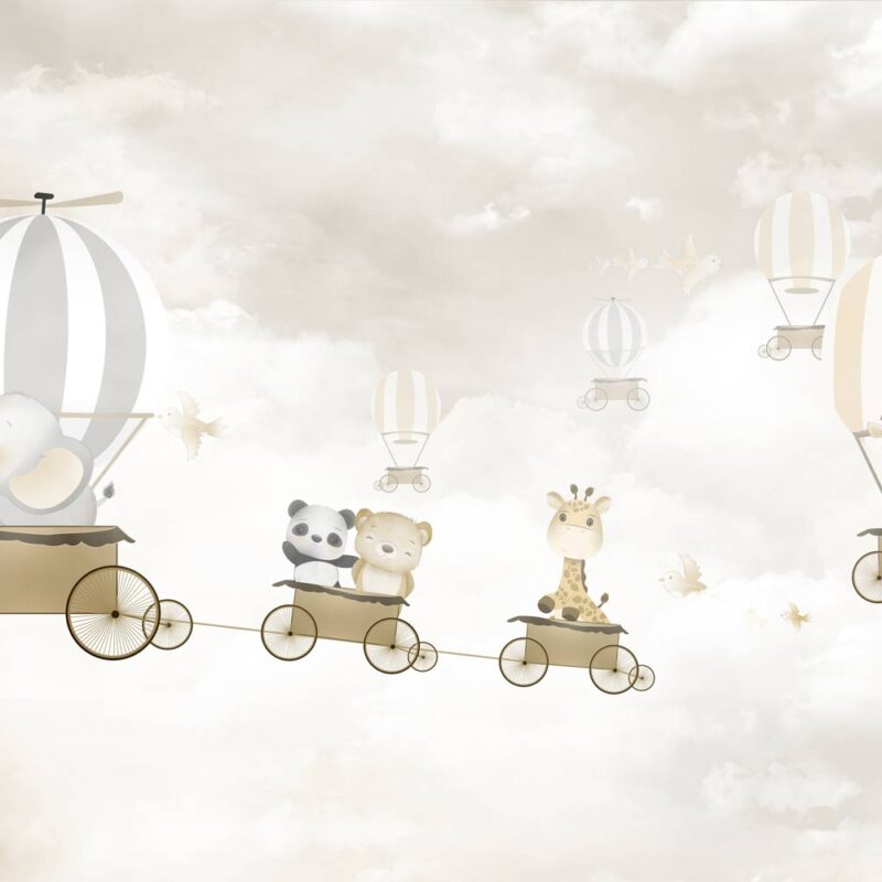 Laissez-vous emporter dans un voyage féérique dans les airs avec notre papier peint mettant en vedette des montgolfières et des animaux dans des tons apaisants de beige. Dans ce décor panoramique, des montgolfières élégantes naviguent gracieusement à travers les nuages et la brume, créant une atmosphère de douceur et de sérénité. À bord de ces montgolfières, des animaux adorables et délicats semblent flotter dans l'air, ajoutant une touche de magie à ce paysage aérien. Que ce soit un panda curieux, un ourson joyeux ou encore une girafa, chaque animal invite à l'aventure et à l'imagination.