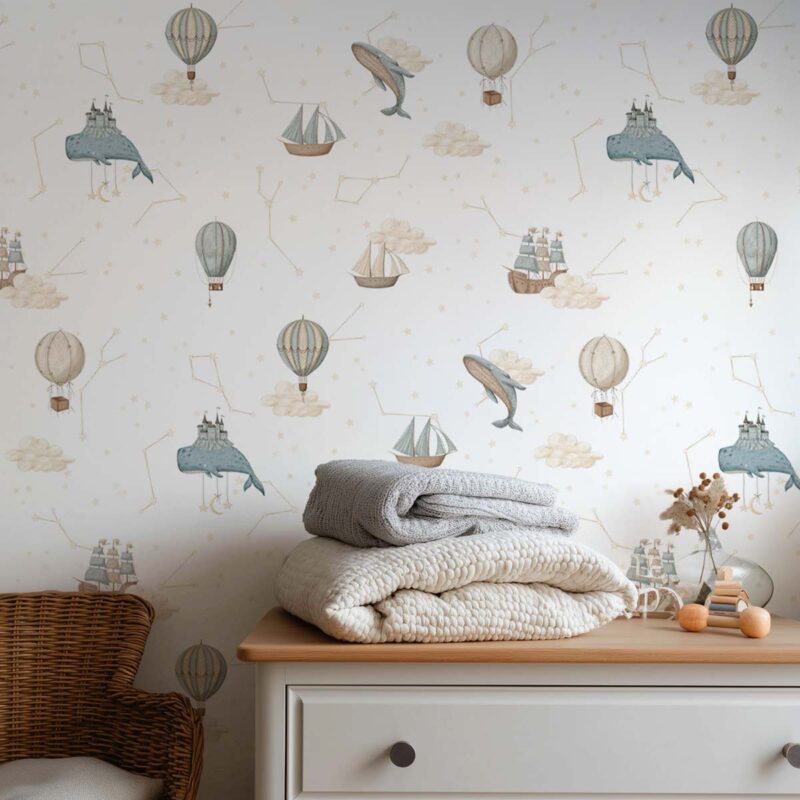 De délicats nuages cotonneux flottent au-dessus de charmantes montgolfières, des baleines majestueuses semblent voguer parmi les constellations. Chaque détail, pensé dans des tons neutres et apaisants, crée une atmosphère élégante et intemporelle, parfaite pour une chambre bébé ou une chambre d’enfant.