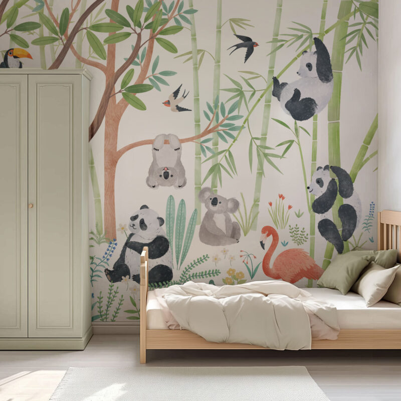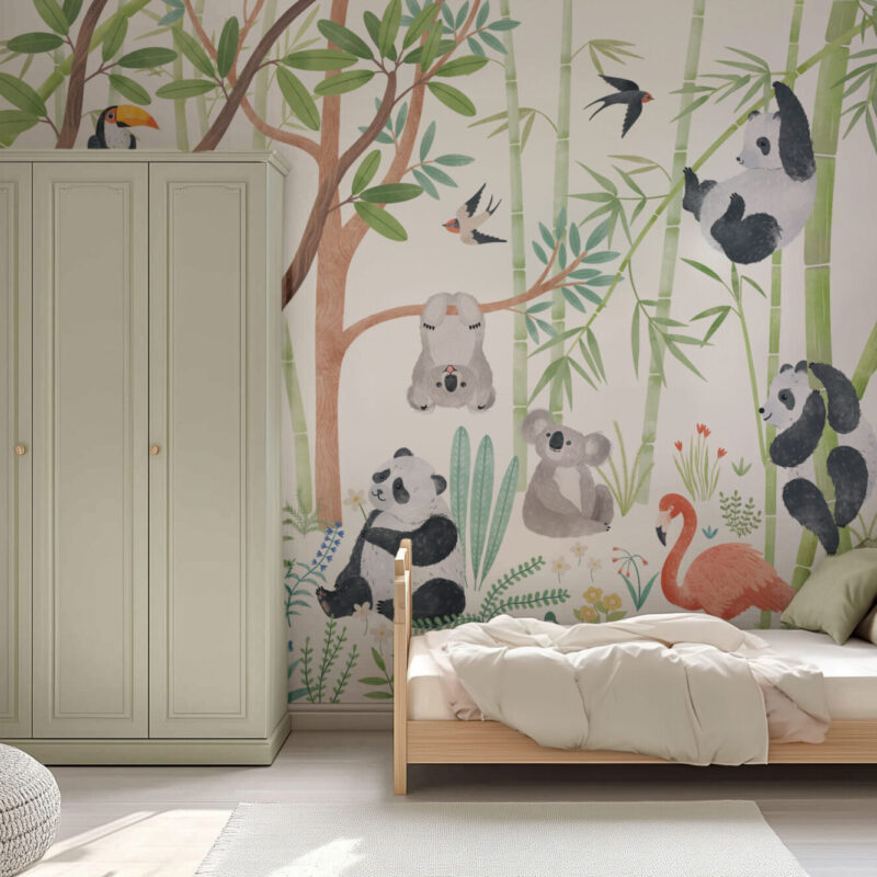 Plongez dans un monde enchanté avec le papier peint panoramique Paradis des pandas. Au cœur d’une jungle luxuriante, des pandas espiègles grimpent aux bambous tandis que des koalas câlins se reposent paisiblement. Un flamant rose élégant apporte une touche de couleur vive, entouré d’oiseaux virevoltants et de feuillages exotiques. Ce décor doux et apaisant crée une ambiance chaleureuse et accueillante, idéale pour favoriser l'imaginaire et la sérénité dans la chambre d'enfant ou de bébé.