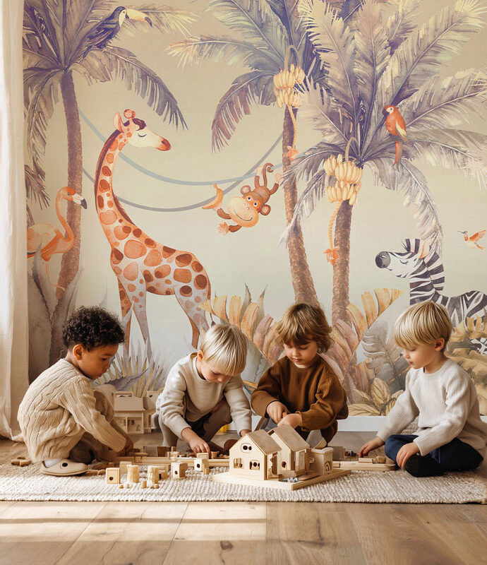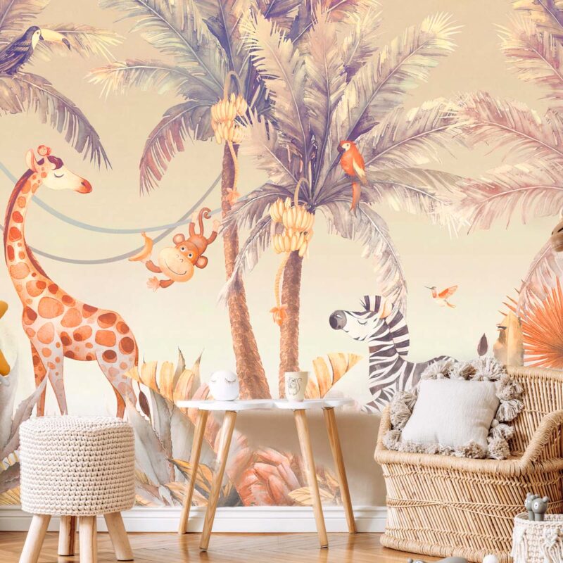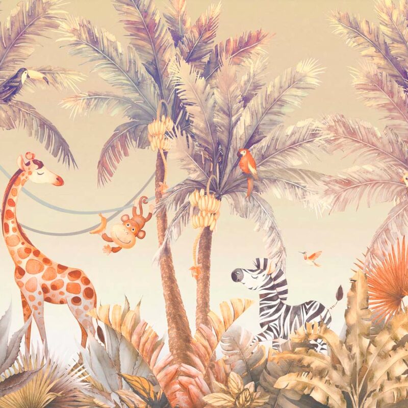 Transformez la chambre de votre enfant en un décor exotique avec ce papier peint jungle aux tons sépia, inspiré des paysages tropicaux. Ce décor panoramique met en scène une joyeuse tribu d’animaux : une girafe fière, un singe malicieux perché avec sa banane, un zèbre élégant, un flamant rose gracieux, ainsi qu’un perroquet coloré niché au milieu de palmiers majestueux. Idéal pour stimuler l’imagination et inviter à l’évasion, ce papier peint animaux apporte une touche chaleureuse et ludique à une chambre d’enfant. Son design raffiné et ses couleurs douces s’intègrent parfaitement dans un univers naturel et apaisant. Fabriqué sur mesure, ce papier peint enfant s’adapte à la taille exacte de votre mur pour un rendu harmonieux et immersif. Offrez à votre petit aventurier une décoration unique où la nature et les animaux prennent vie ! Découvrez d'autres papiers peints avec animaux ou palmiers sur notre site.