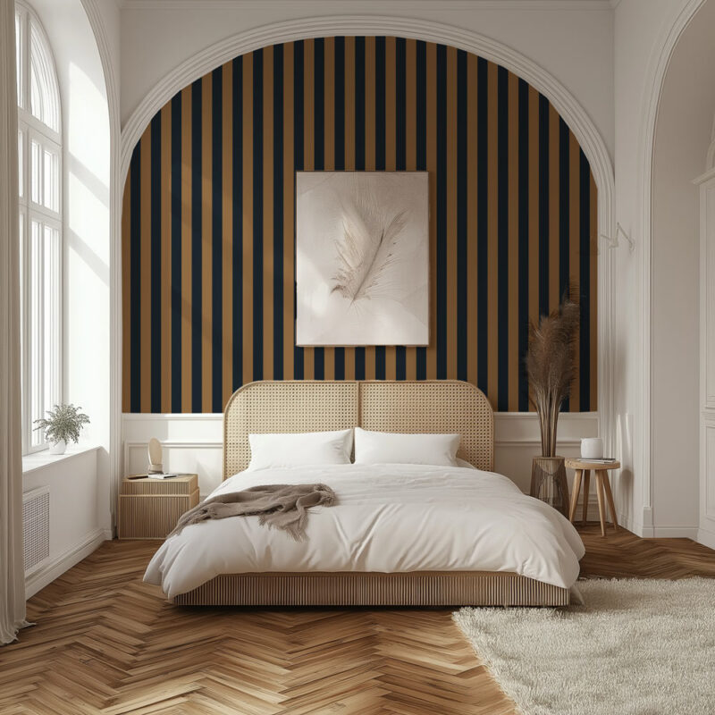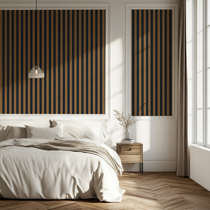 Le papier peint Bronzite marie le marron et le bleu marine dans un jeu de rayures verticales sophistiqué. Ce duo profond habille l’espace avec caractère, tout en conservant une allure élégante. Issu de notre collection Impériale, ce modèle est disponible en rayures larges (9 cm) ou rayures fines (5 cm). Cette tapisserie trouve facilement sa place dans une chambre ado ou adulte, en mur complet ou en soubassement pour une personnalisation murale affirmée.