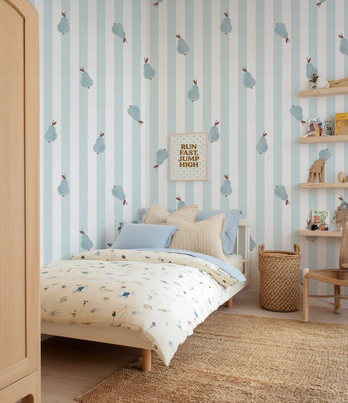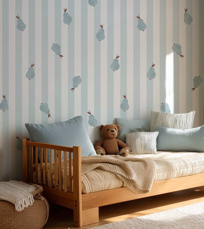 Invitez la douceur et l’originalité dans la chambre de votre bébé ou de votre enfant avec ce papier peint à rayures bleu ciel rehaussé de délicates poires illustrées. Son motif unique associe la fraîcheur des rayures pastel à la fantaisie des fruits stylisés, créant une atmosphère à la fois apaisante et pleine de charme.