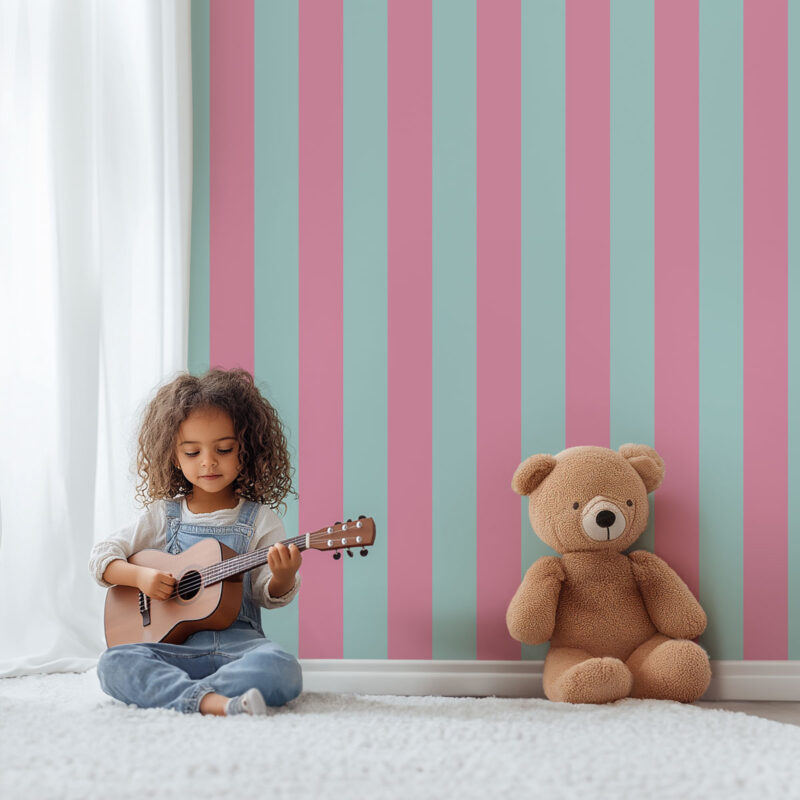 Ce papier peint à rayures verticales associe un vert turquoise clair et un rose doux, créant un contraste à la fois rafraîchissant et énergique. Ce duo de couleurs plein de peps apportera une touche de vivacité à n’importe quel espace de votre intérieur, de la chambre d'enfant à celle des parents. Le mélange harmonieux de ces teintes dynamise l’ambiance tout en maintenant un équilibre subtil. Disponible en rayures larges (9cm) ou fines (5cm), il s’adapte à vos envies pour une décoration moderne et originale. Cette tapisserie met en valeur chaque espace, en apportant fraîcheur et caractère. Un choix audacieux qui allie tendance et personnalité.