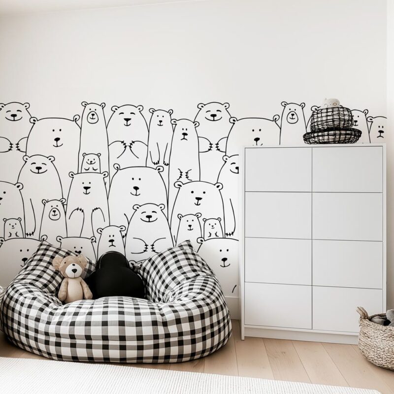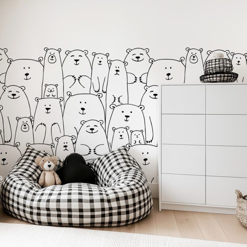 Apportez une touche de douceur et de malice à la chambre de votre enfant avec notre papier peint Petits Oursons. Sur un fond blanc épuré, de charmants oursons dessinés en noir, au look rigolo et minimaliste, s’amusent et se répètent comme une ritournelle joyeuse. Ce papier peint enfant s’inspire des codes du design scandinave : lignes simples, palette monochrome et ambiance douce, parfaite pour une chambre apaisante et moderne. Il s’associe facilement à des meubles en bois clair, des textiles en gaze de coton ou des touches de couleur pastel pour un univers nordique harmonieux.