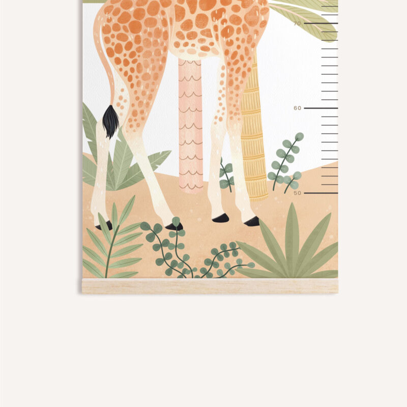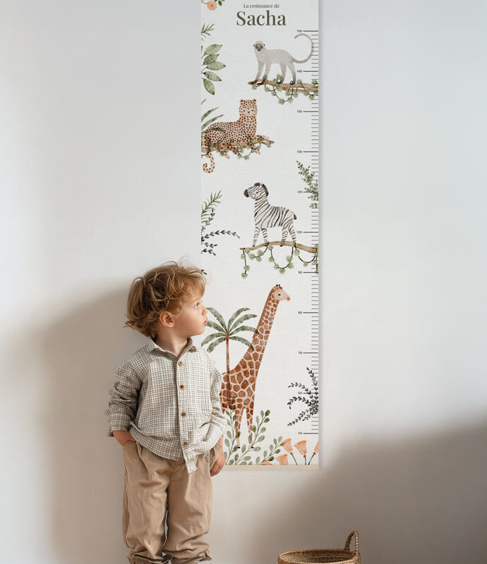 Plongez dans l’univers fascinant de la savane avec notre toise délicatement illustrée. Une girafe majestueuse, un zèbre curieux, un guépard agile et un lémurien espiègle se succèdent à différents niveaux, créant un petit voyage visuel à chaque centimètre. Sa palette douce et naturelle s’harmonise parfaitement à tous les décors.
